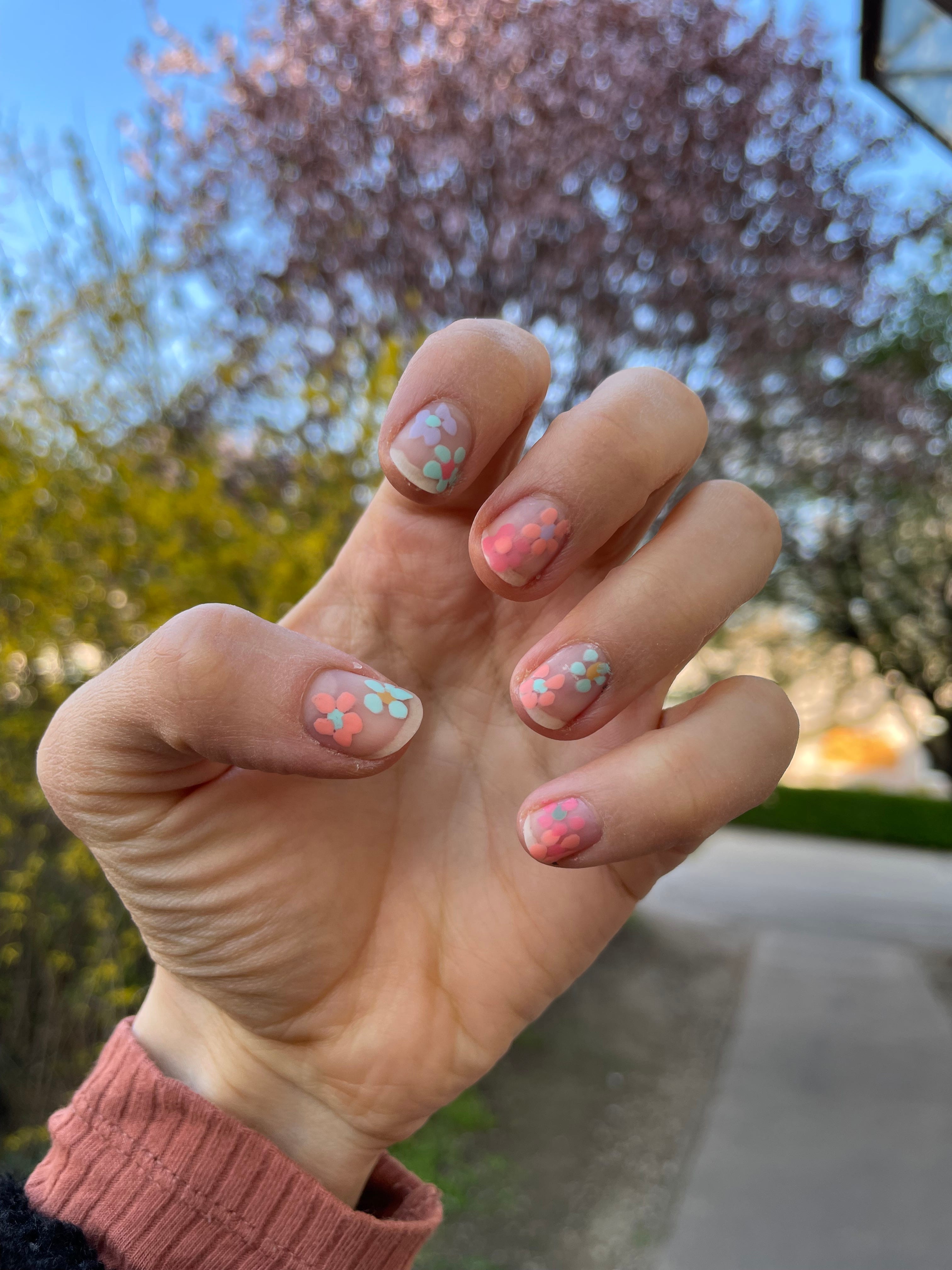 I did this manicure as an artist date. An artist date is part of the Artist’s Way which I’m doing for the second time now and it is basically a date with yourself. It should be done once a week, and ideally, they should be planned ahead of time, put into your calendar like you do for other people and events. I still fail to do it this way, I have to get into why later, but last week, I spontaneously did this manicure for myself and I called it my artist date for the week. I loved how the weather started to get warmer and warmer, how the flowers and trees started to blossom and it slowly started to feel fully spring. I first practised how I could make a flower with the basic brush the nail polish comes with, how much nail polish I need for a tiny dot, how much pressure should I put onto my nail to come out as a well-rounded dot and what colours go nicely together. After one trial and error set of nails, I wiped them off, and redid it with the skills I acquired in the first round and I loved how it turned out. My left hand is pictured here though which I did with my more skilled right hand. My right hand didn’t turn out like this so don’t believe everything you see 😉 It was so much fun to experiment and I enjoyed the process.